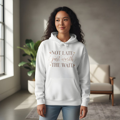 Hoodie — "Not Late, Just Worth the Wait" Cozy Inspirational Pullover